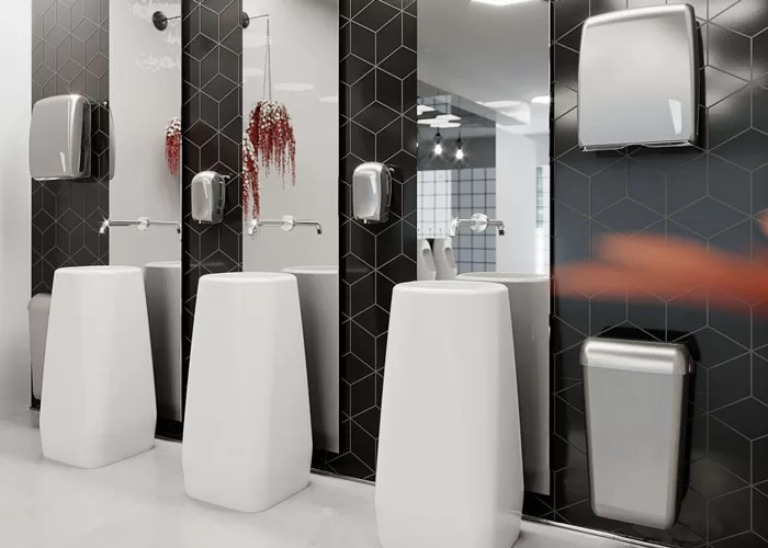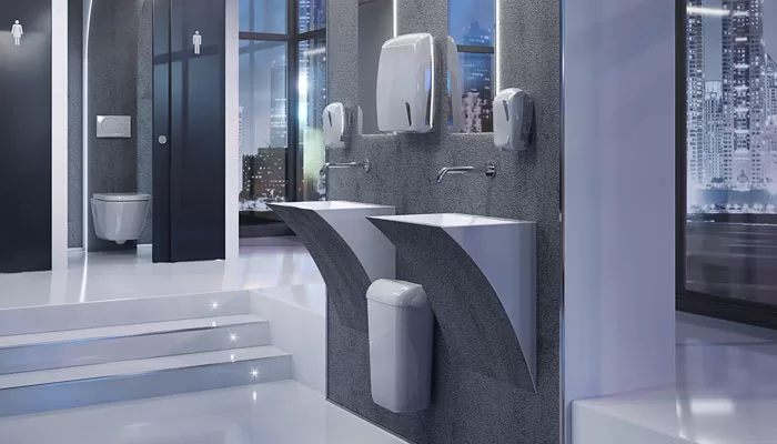 Κομψοί διανομείς χαρτιού, σαπουνιού και απορριμμάτων.